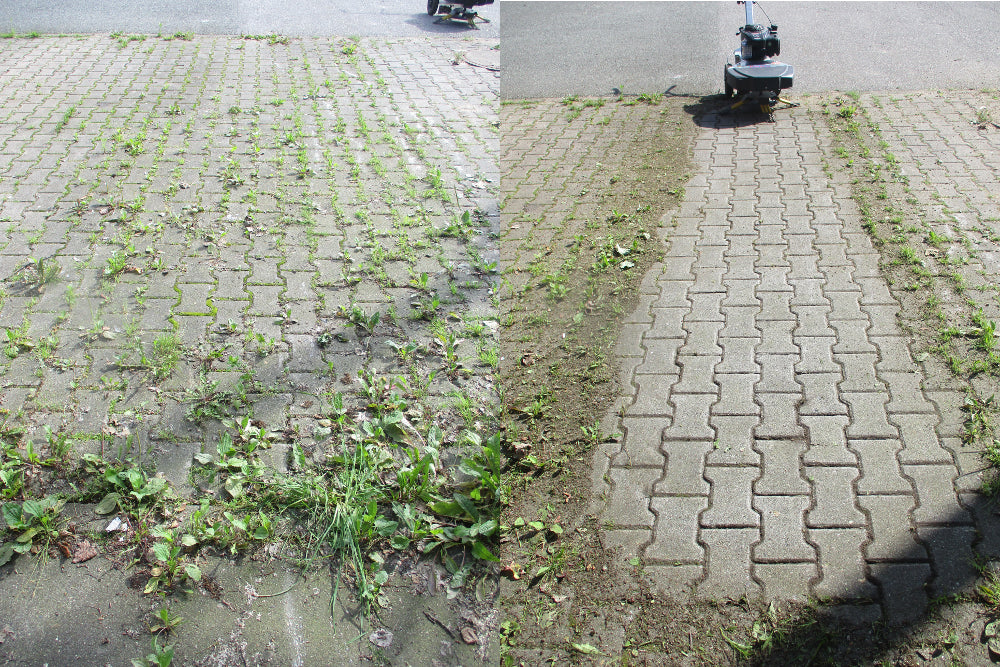 Der Kwern Greenbuster Home 550 erleidigt alles zusammen in einer Anwendung. Die kräftigen und flexiblen Stahlbürsten entfernen unerwünschtes Wildkraut zwischen den Steinen auf Gehwegen, Zufahrten, Terrassen, Parkplätzen und dergleichen.